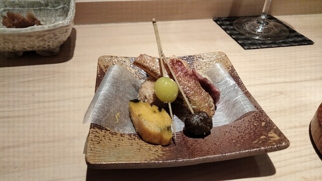 吹き寄せは鰰のソテーと牛肉、蓮根と秋鮭の挟み揚げ、銀杏とムカゴの素揚げと木の葉南京、どれも秀逸