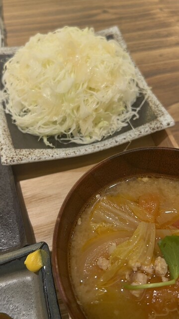 豚汁、キャベツ、柴漬け、温玉、冷奴、ご飯のプレートが出て来て、