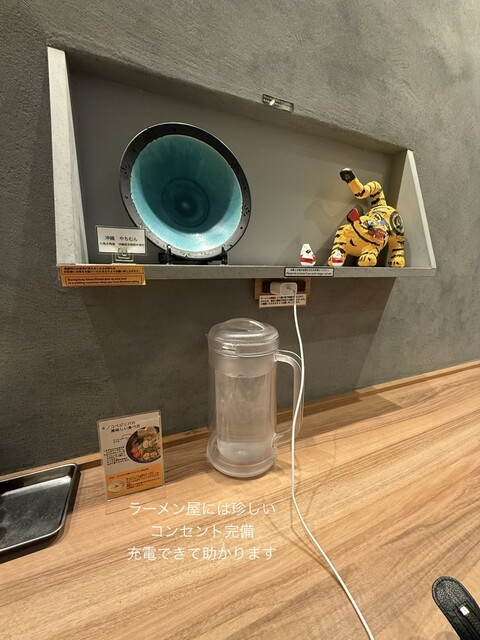 ラーメン店には珍しくコンセントがあります。新幹線の車内で酷使して減ってしまったスマホのバッテリーを充電出来るので有難いです。