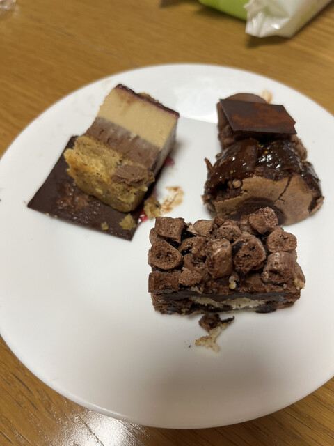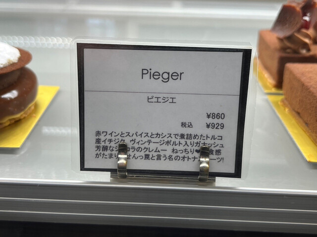 ピエジエ、チョコレートのムース、ガナッシュ、干しイチジクの赤ワイン煮。チョコレートの滑らかなムースとビターなガナッシュが何層かになってます。それぞれ濃さ、食感が少しずつ異なり、味のグラデーションになってる。イチジクは深い甘味と何故か生き生きとした風味を感じます。このイチジクがチョコレートの層を纏め上げてます。とっても濃厚で、味わい深いケーキです。