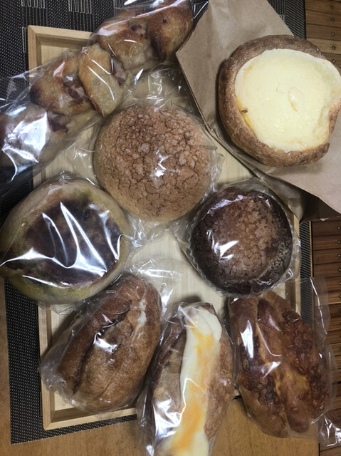 ピティビエ、クリームチーズデニッシュ、チョコクロワッサン?クリームパン、ブロッコリーとエビのグラタンパイ、ベーコンエピ、塩豚入りのハード系パン(パンの名前覚えてなくて適当です)