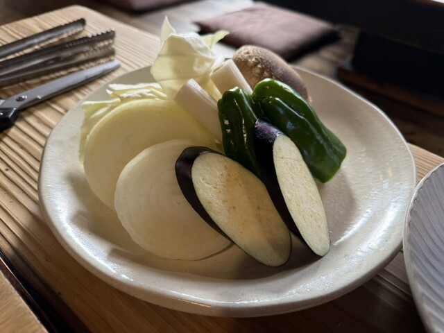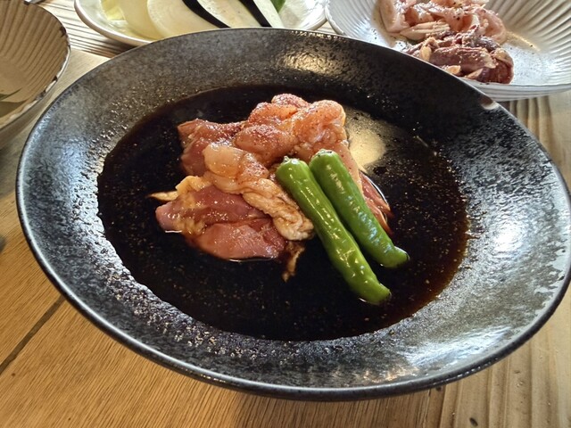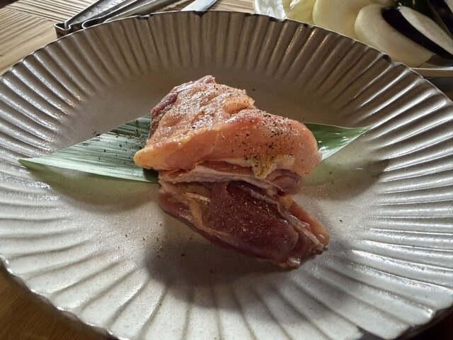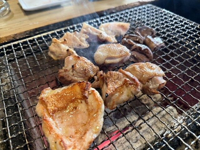地鶏/タレ、塩にズリ、ハツ、焼き野菜。