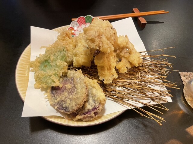 舞茸の天ぷらを注文したのですが、ボリュームにびっくり、しそもさつまいももついてる、、、!?