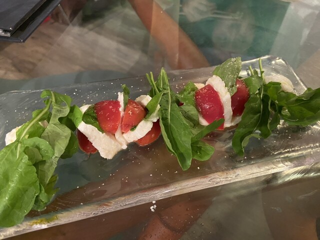 まずはシャンパンで喉を潤します。定番のエンボカサラダはオーダー必須。彩が美しい前菜の盛り合わせ、きのこの生パスタ、レンコンのジェノベーゼピッツァは生ハムとハーフ&ハーフで。