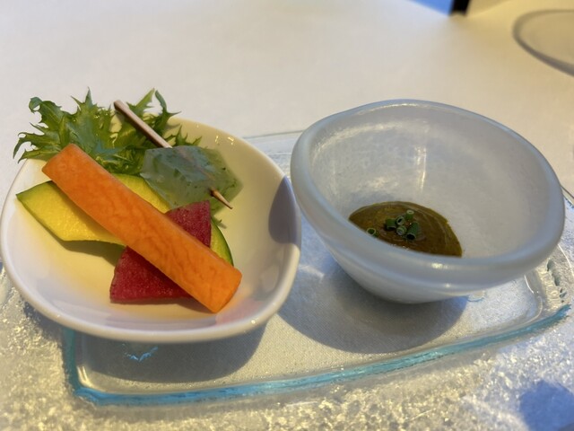 アミューズのあとにメニュー外で伊勢志摩野菜、鮑の肝のディップが振る舞われました。思わずシャンパンが進みます!