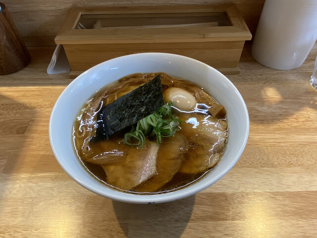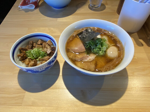 特製醤油らぁ麺は霧島ロイヤルポークバラ肉1枚、肩ロース肉2枚、ワンタン2個、味玉1個、支那竹、のり、ネギとトッピングもボリューミーです。刻みチャーシューご飯は今回初です。