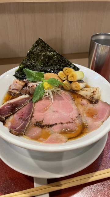 オススメは特製鴨そば、通常の醤油と異なりレアチャーシューに鴨が2種のってきます