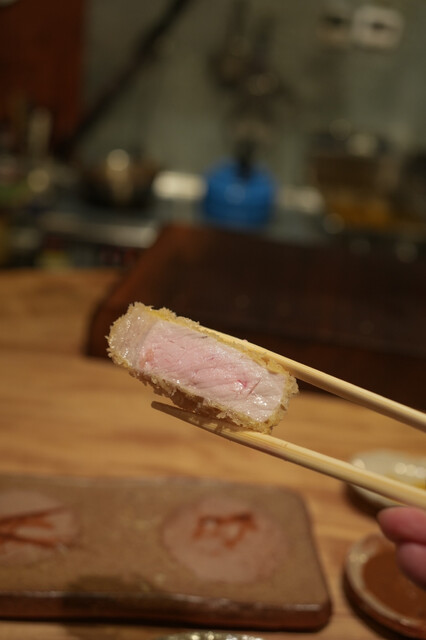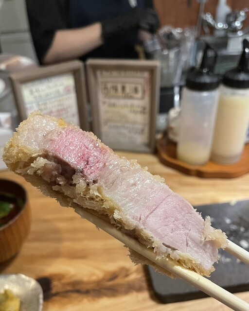 とんかつは串カツスタイルで1切れごとにベストタイミングで提供されるので出てきた瞬間に口に運ぶのがオススメ