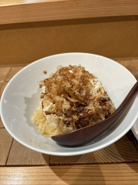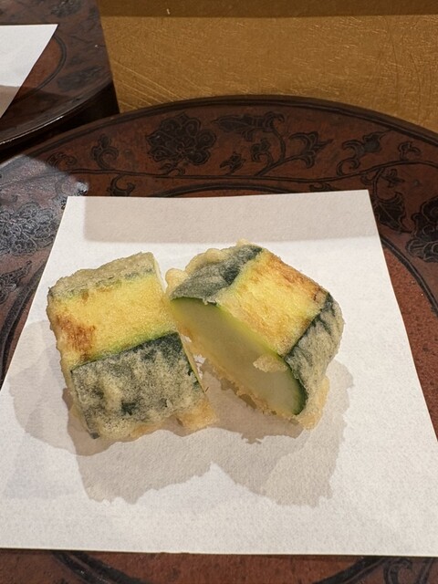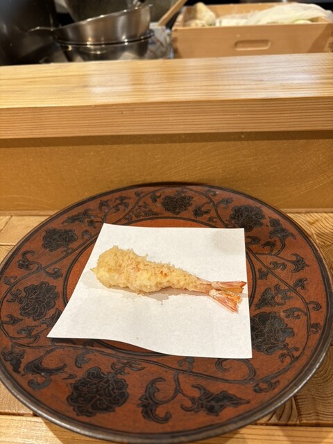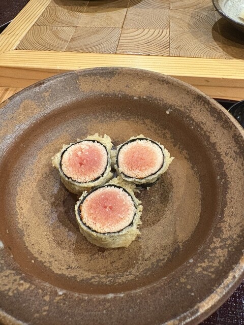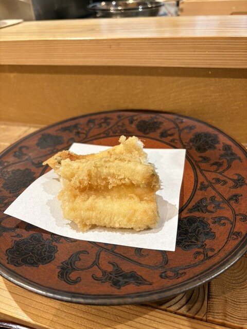 今回は初めて「明太子の海苔巻き天ぷら」をいただきました。明太子の塩気と旨みに、カリッと揚がった海苔と衣が絶妙にマッチしていて、一口ごとに満足感がありました。揚げたての香ばしさと、海苔の風味がふわっと広がる感じがたまりません。