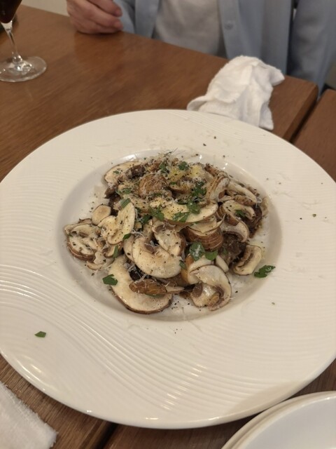 牡蠣と帆立のムニエルマッシュルームサラダ→濃厚なバルサミコ酢と赤ワイン?のソースがマジで美味しくて飲める。帆立も牡蠣も柔らかくてソースとよく絡んでて美味しかった!これはきのこがマジでたっぷり載ってていい!マッシュルーム歯ごたえとさっぱりした味が濃厚なソースと絡むともう、、美味しすぎる、、、