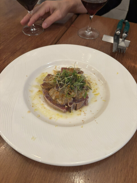 鹿肉もも→脂の少ない赤身肉は最高です!ソースがバルサミコ酢と赤ワインの甘めなソースだった!甘さも砂糖っていうよりは蜂蜜に近い感じでそれがよかった!ルッコラともすごい合う