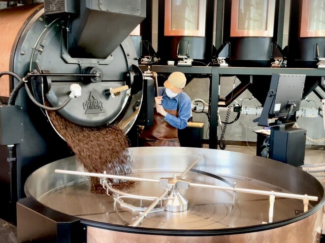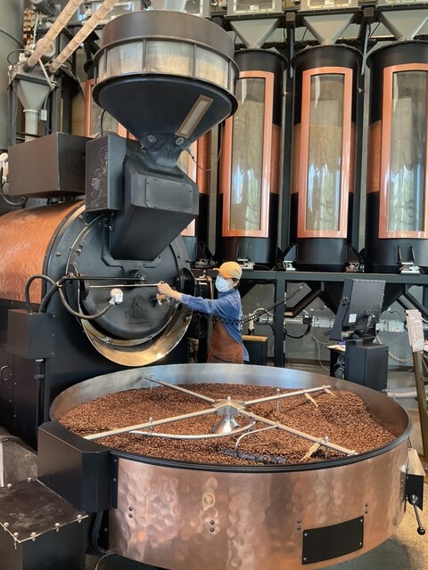 豆が焙煎されてザーと出てくる瞬間を教えてくれました。単に作業に集中している作業員ではないのです。今日の目的として飲み行ったエスプレッソの豆です。最初、巨大な機械に圧倒され工場みたいだなと感じて、さっさと三階に上がり飲んでしまった帰りがけのことです。人がつきっきりで操作し、その優しい人が焙煎の度合いで色が違う豆を比べて見せてくれたりもします。