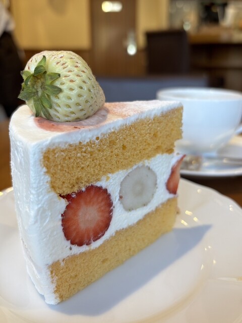 ショーケースのケーキも美味しそうだったので、追加でケーキセットもいただきました。希少な白いちごを使用したショートケーキです。