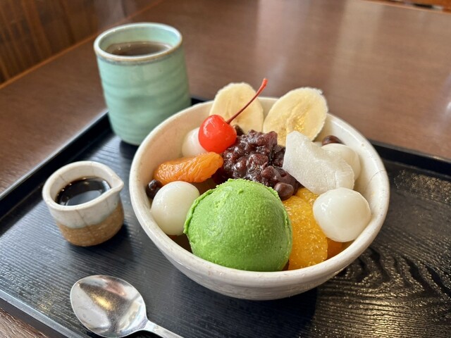 あんこはふっくら柔らか、白玉はもきゅっと弾力あり、寒天は大きめでゴロゴロ入っています。抹茶アイスは色も味も濃く滑らか、フルーツはさくらんぼ、バナナ、みかん、あんずが盛られ彩豊かです。中でもあんずがジューシーで印象に残る美味しさでした。