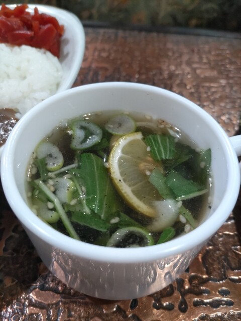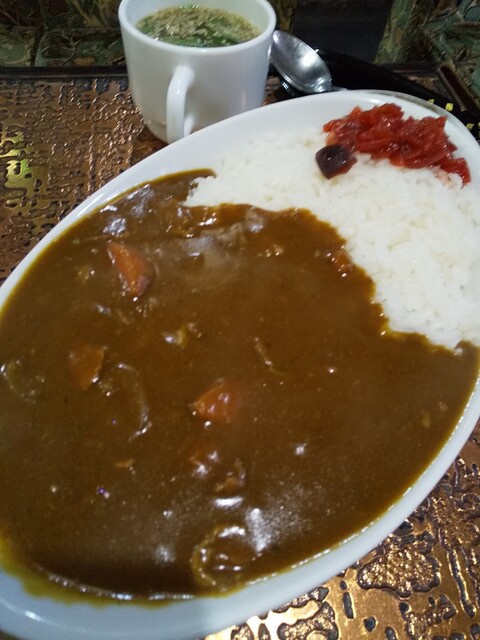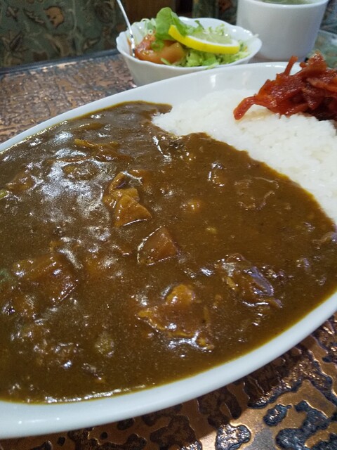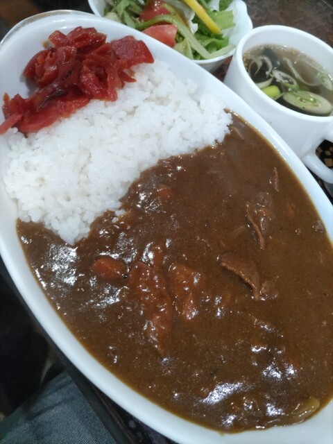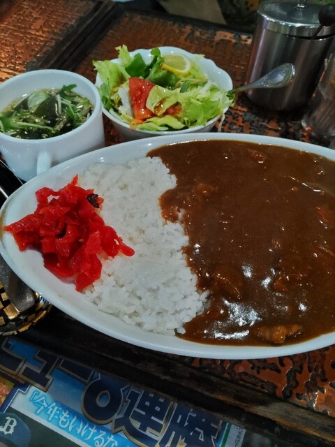 11時30分頃、約3カ月半ぶりの訪問です。喫煙OKで愛煙家の来店が多い喫茶店のため、なるべくタバコの煙を避けるためには早い時間に伺うしかないのですが、ここ最近はその機会がありませんでした。注文はいつも通りの「カレーライス」。野菜サラダとスープ、食後にドリンク(アイスコーヒーをチョイス)が付きます。周りはパスタ(並盛でもすごい量!)を注文されている方が多いですね。いまだ注文したことがありませんが、かなり空腹の際にはいつか食べてみたい。最近はインド・ネパール系のカレーにもハマっていますが、やはりこちらのTHE・日本のカレーライスは美味い。やや辛口で、ライスの量(そこそこ多い)も丁度良い。真っ赤な福神漬けも合いますね。どうもご馳走様でした!