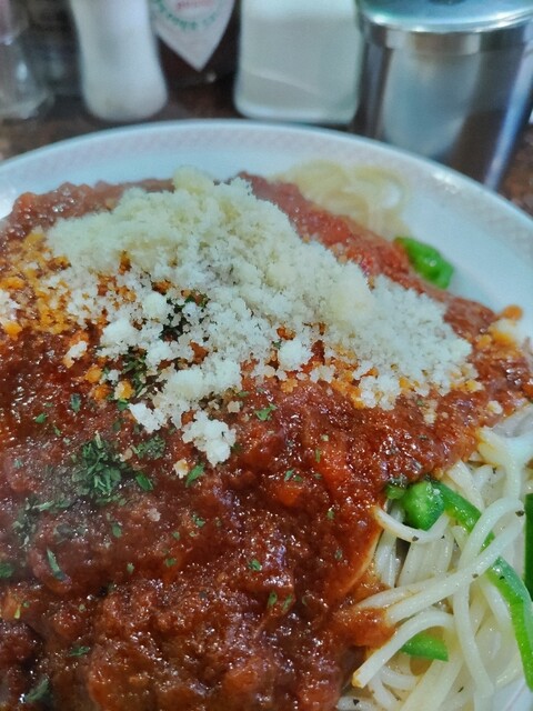 この日は時間の調整ができたため11時過ぎに訪問(早く行ってなるべくタバコの煙を避けたいので)。量が多いと噂の(カレーライスも多いけど)、そして「アーモンド」さんの名物メニューでもあるパスタを初めて注文。味は7種類ある中から基本のボロネーゼ(ミートソース)を選択しました。麺は細目、茹で加減は結構柔らか目です。ソースがたっぷりかかっており味に飽きることは無いものの、途中で粉チーズとタバスコで変化を付けました。思いの外あっさりと完食。調子が良ければ大盛りでも行けそうな気がしますが、危険なのでやめておきます。。隣のテーブルの方はカレーライス大盛りでしたがやっぱり凄い量だな。店内混み合ってきたので滞在時間30分ほどで退散(先客3名、後客4名ほど)。次回は別のパスタを注文してみたいけど、やっぱりカレーライス(こちらのカレーがマイベストカレー)かなあ。ご馳走様でした!