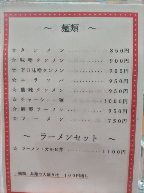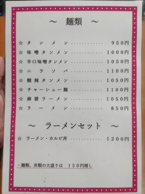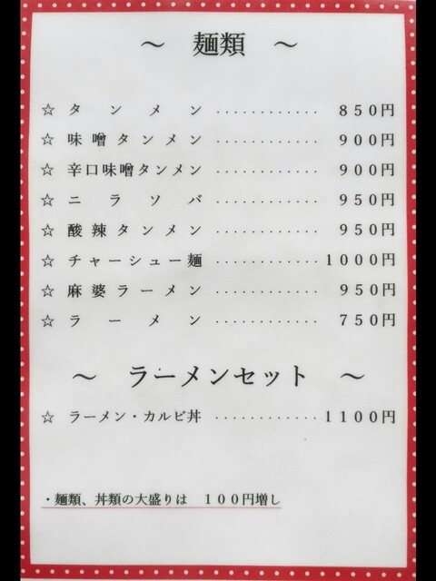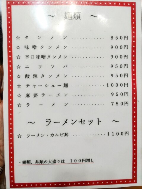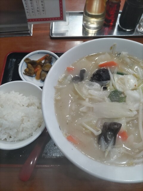 12時55分に訪問。この日の前客なんと23名(36名で満席)うち14名はまだ料理が提供されておらず。この時間帯としてはすごい混雑っぷりです。しかしこの日は「十八番」と決めていたので諦めませんでした。しばらく(ランチでは)来ることができなくなりそうなのでね。これまでに何度通ったかな。通算100回は超えているかなあ。1番テーブルをゲット。注文は最も食べている「タンメン+サービス小ライス」。この日は麺硬にはせず普通でオーダー。メニュー表が新しくなっていました。価格改定ですね。1000円未満のメニューはラーメン850円、チャーハン900円、タンメン950円の3つになってしまった。致し方なしか。注文から20分ほどで着丼。十八番のタンメン、やっぱり最高。ご馳走様でした!