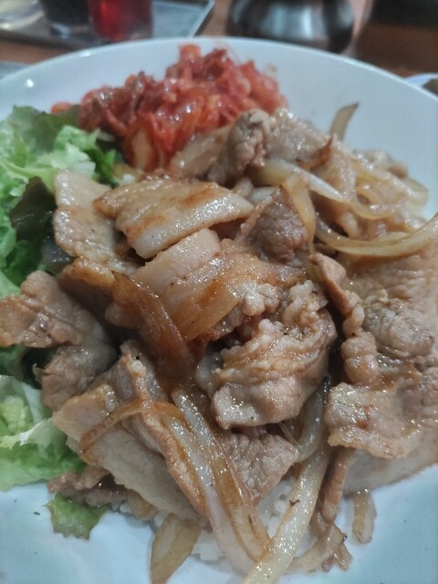 2週連続の訪問。11時半過ぎに入店した際に先客は1名でしたが、お店を出るまでに13名ほどが来店してすべてのテーブルが埋まり相席となる方も。相変わらずランチ人気が高いですね。この日は事前に決めていた「キムチカルビ丼」を約4カ月ぶりに注文。まずはいつも通りスープにお酢と辣油を投入(今回は初めて辛味粉もイン)。このキムチカルビ丼、少し前から平皿での提供に変わっていたことを忘れていました。ただしボリュームは健在。思った以上に豚バラ肉の量が多いです。ご飯の量は気持ち減ったような気もします(高値が続いていますからね…)。始めのうちはキムチを混ぜずに豚バラとご飯とレタスのみでいただきます。それだけでも美味いなあ。そしてキムチを混ぜ、渾然一体となったところをバクバクといただきます。キムチの甘辛さと豚バラ肉の脂、それらをご飯が包み込むような感じ。はい、大満足。どうもご馳走様でした!