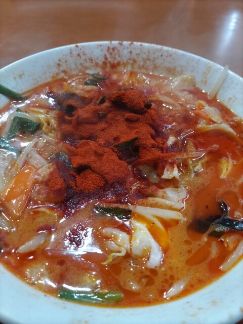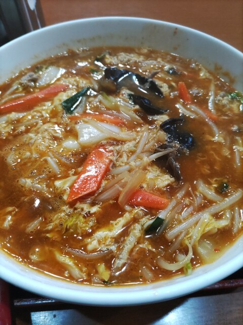 休日で疲れた身体が野菜と酸味を欲したために13時前に訪問。先客は4名のグループと一人客が2名、後客は4名ほど。メニューには無い「麻婆丼」をオーダーしている方がいました。頼めるんだな、と。野菜と酸味といえば「酸辣タンメン」です。こちらの酸辣タンメンを注文するのはおそらく通算でも2度目(数年ぶり)との記憶。軽くとろみが付いた、酸味と少しの辛味があるスープに野菜がたっぷり入っています。スープは熱々で、硬めの麺にマッチして美味い。最後は酸辣丼を自作していただきました。どうもご馳走様でした!