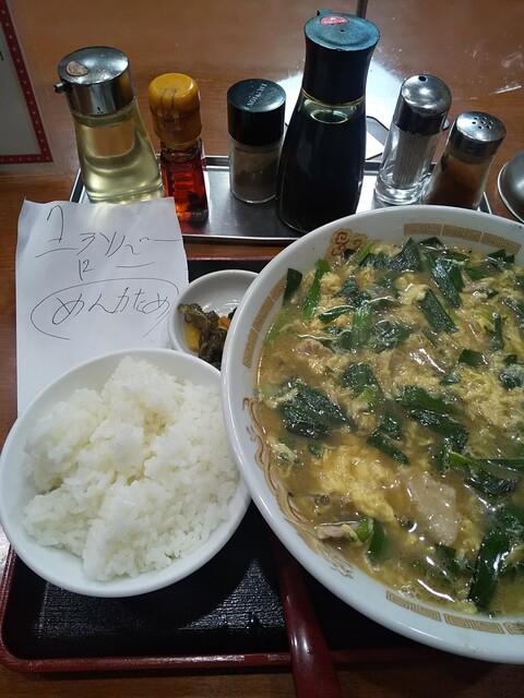 13時過ぎ、2週連続での訪問。この日は空いており、前客4名・後客2名だったかな。肉類は避けたい気分のため、こちらのお店では数少ないヘルシーメニューともいえる「ニラ玉定食」を注文。ごはん、お新香(業務用キューちゃん)、スープ、茹でもやしのセットです。スープにはたっぷりのお酢を入れラー油を少々垂らすのがお気に入り。ニラ玉はいつも通りふわふわの仕上がり。下にはたっぷりの千切りキャベツが敷かれ、カットレタスとミニトマト半分がマヨネーズとともに添えられています。最後はニラ玉にマヨネーズが絡まり、その味わいがまた良いです。本日もご馳走様でした!