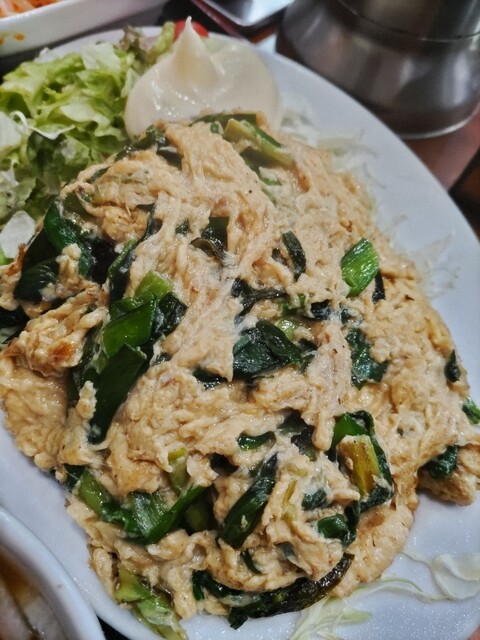 こちらのニラ玉は、濃い目の味付けのメニューが多い中でも味は濃くなくあっさりとしており軽く食べることができます。大きなオムレツにニラが入ったイメージ。スープ、茹でもやし、お新香、ライスと、バランスを取りながら完食。ニラ玉の下に敷かれているレタスとキャベツ(+マヨネーズ)が嬉しいですね。ご馳走様でした!