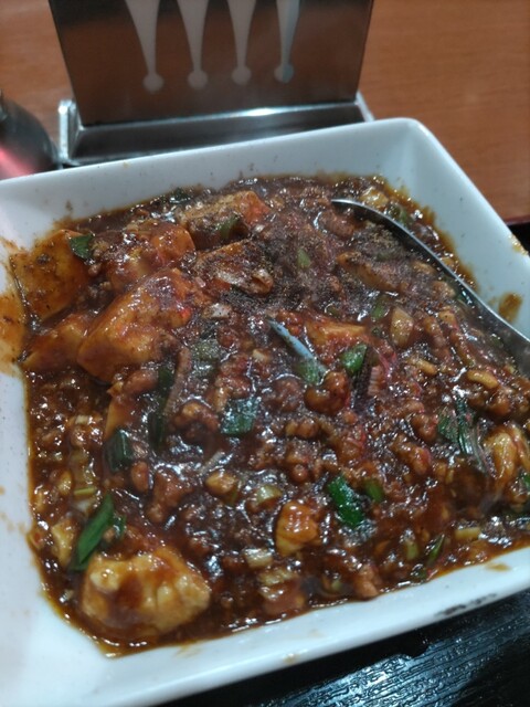 さて油淋鶏は千切られたレタスの上に大ぶりの鶏の唐揚げが7個半~8個ほど鎮座しており、その上に甘めのソースと長ネギのみじん切りがたっぷりかかっています。以前は壁の写真にあるように、揚げられた大きな1枚の鶏もも肉をカットして提供されていた記憶が。