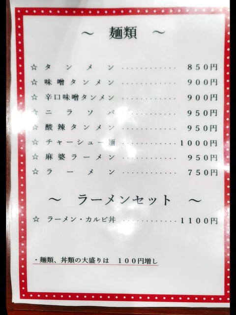 11時20分過ぎに2週連続での訪問。早い時間帯だったので空いていると思いきや結構混んでおり、食べ終わってお店を出る頃にはほぼすべてのテーブルが埋まっている状態でした。さて2カ月ぶりの「辛口味噌タンメン」ですが、野菜がたっぷりでスープは程よい辛さと甘さ。この日の野菜はやや硬めでしたかね(できればもっとしんなりしている方が良かったな)。このスープはライスに良く合います。この日はなぜかラーメンを注文している方が多かった(4人組で全員ラーメンとか)。その他にはラーメンセット(ラーメン&カルビ丼)、麻婆豆腐定食、油淋鶏定食などの注文が入っていましたね。ご馳走様でした!