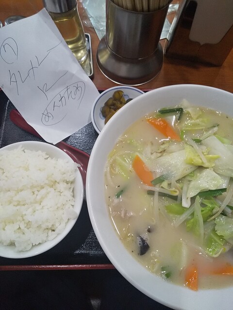 その他のランチメニュー:【麺類】①タンメン、②味噌タンメン、③辛口味噌タンメン、④ニラソバ、⑤酸辣タンメン、⑥チャーシュー麺(未食)、⑦麻婆ラーメン、⑧ラーメン(未食)、【セット】⑨ラーメン・カルビ丼、【丼・定食】⑩チャーハン、⑪キムチカルビ丼、⑫麻婆豆腐定食、⑬ホイコーロー定食、⑭青椒肉絲定食、⑮肉野菜炒め定食、⑯ニラ玉定食、⑰生姜焼き定食