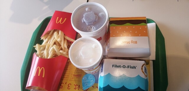 昼マックでフィレオフィッシュにフラポM、アールグレーティーセット、主人は、ビックマック、フラポM、マックシェイクバニラSセットをキャッシュレスでオーダーしました。