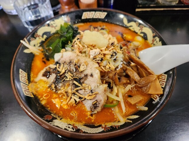 10分程で着丼しました。早速スープをズズズ。お、いい感じの辛さ加減です。卓上にある『揚げにんにく』、『揚げたまねぎ』、『すりごま』をタップリ乗せて食べ始めます。