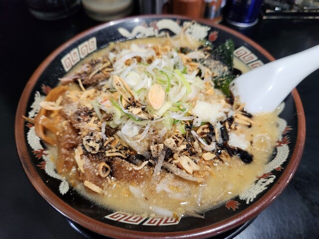 10分程で着丼です。卓上の『揚げたまねぎ』、『すりゴマ』、『おろしにんにく』、『マー油』をタップリと乗せていただきます。