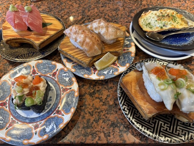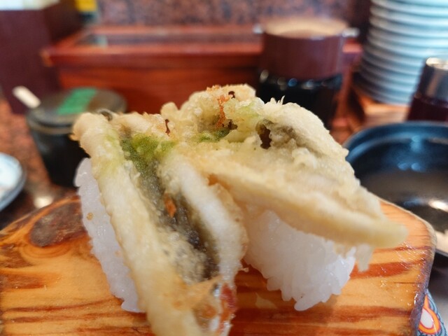 初夏メニューのあなごの天ぷらにぎりや他の商品をおいしくいただきました。あなごの天ぷらにぎり、抹茶塩がかけてありサクサクふわふわでおいしい!他にも季節メニューで柚子胡椒シリーズもあるとのことでおいしくいただきました。通常メニューのいくらとネギトロもおいしかったです、ごちそうさまでした!