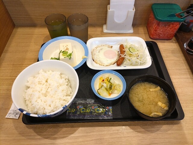 ソーセージエッグ定食特盛、牛皿、冷やっこ