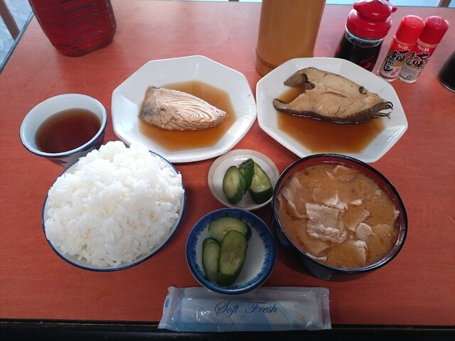 トンボ節の煮付け、カレイの煮付け、めし中、ぶた汁
