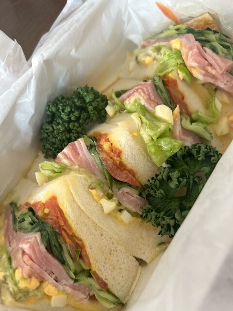持ち帰っていただきました。まず、開けてびっくり!!箱いっぱいの具材たっぷりサンドイッチ。華やか^_^