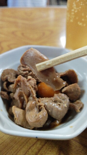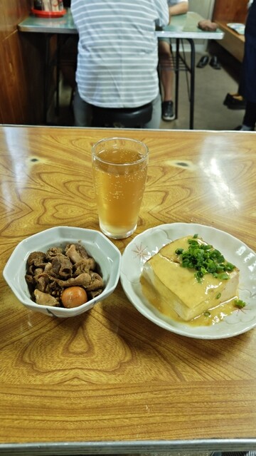 まず、中華そばが来るまでは、おでんの豆腐とたまひもを突きます。