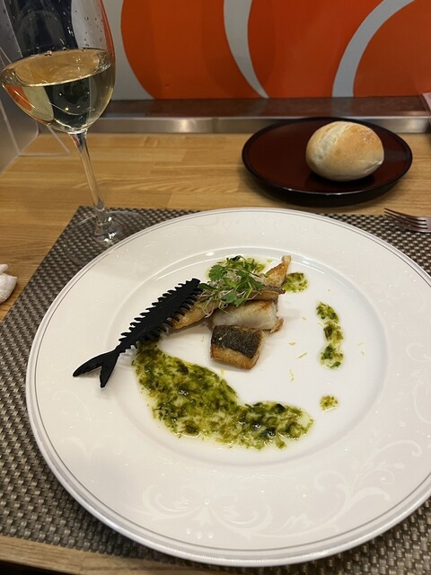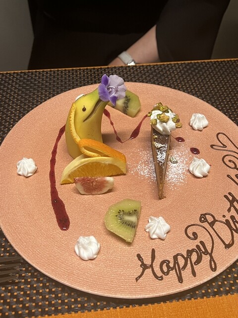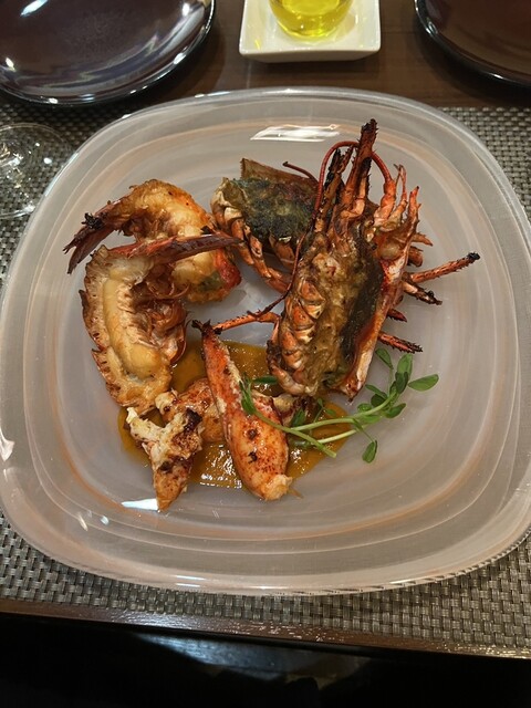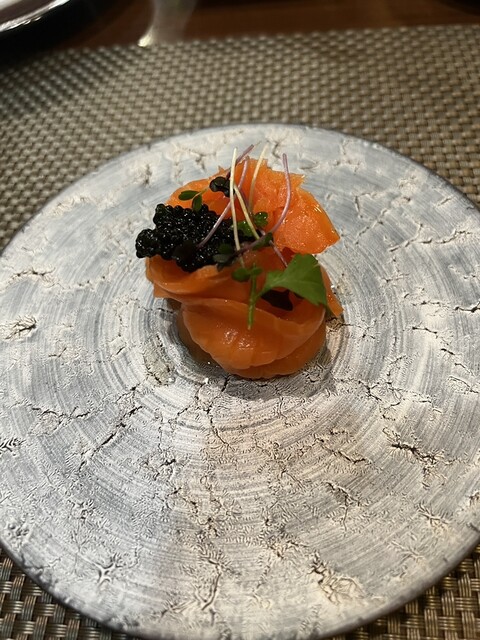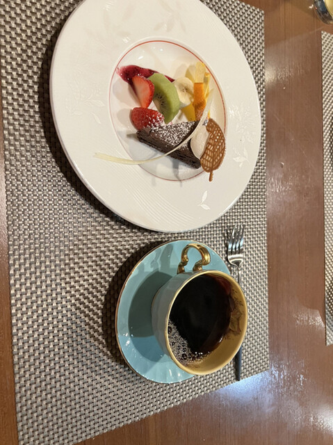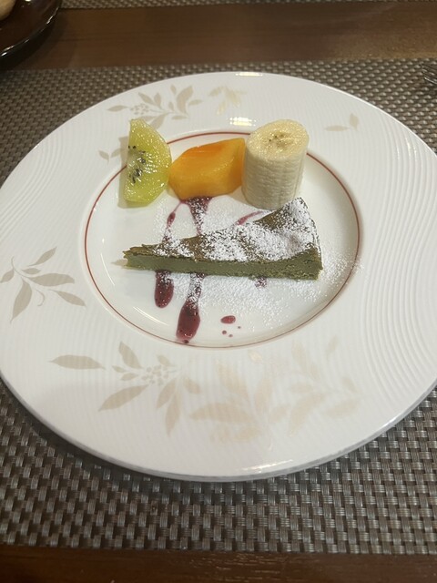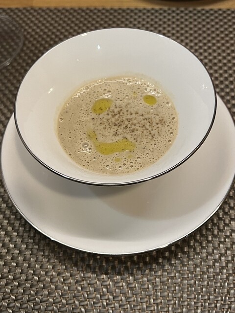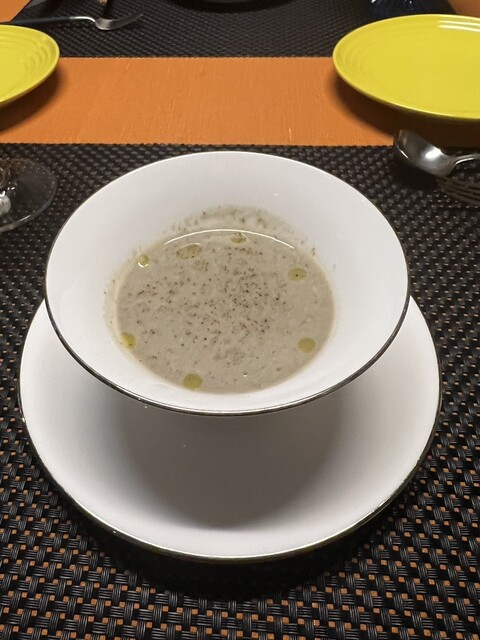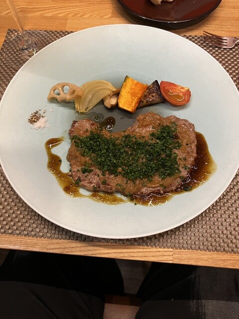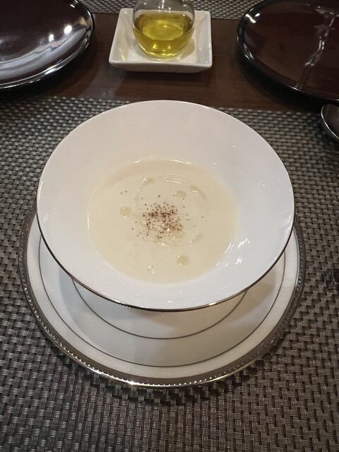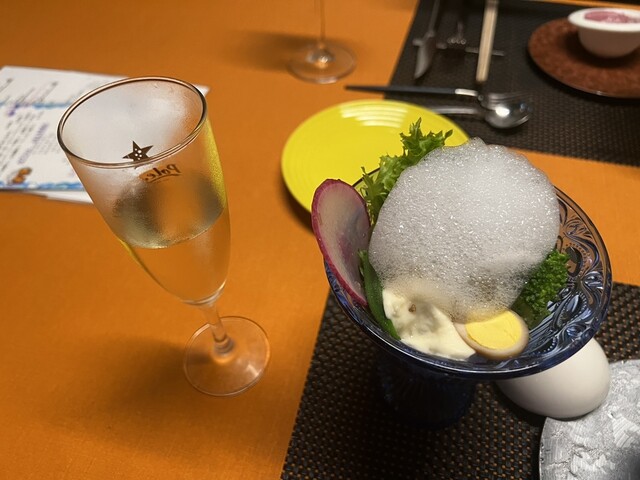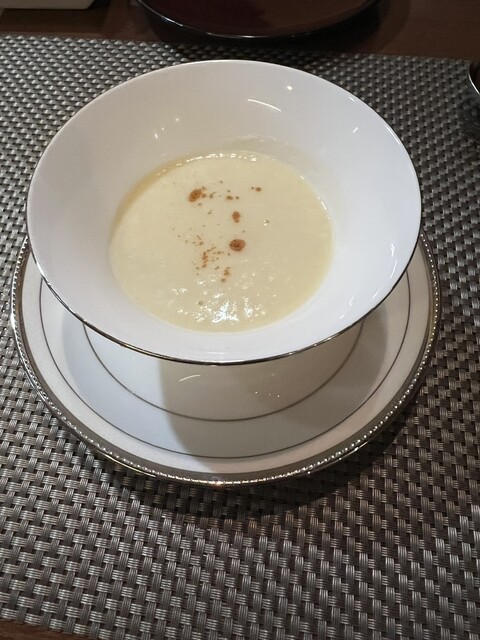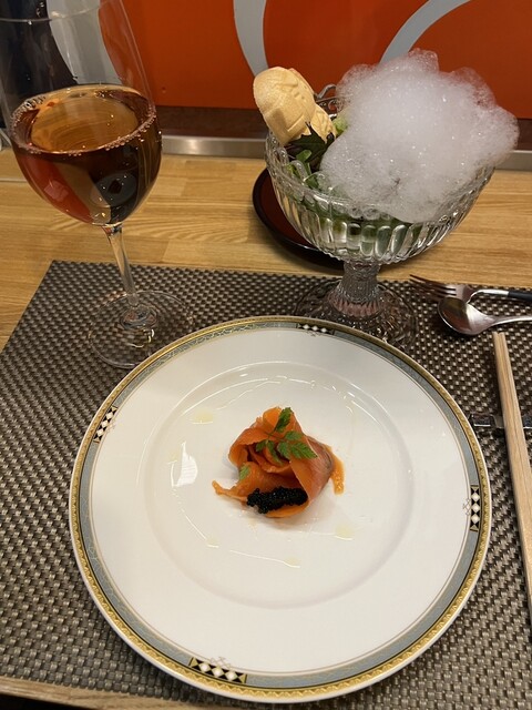 トマト水 前菜のサラダ 桃のポタージュ サーロイン デザート コーヒー を頂きました
