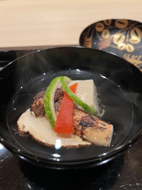七輪で焼かれた奈良県松茸、きのこ豆腐、パプリカ。ここに先ほどの一番出汁が注がれます。香りがたまらん✨