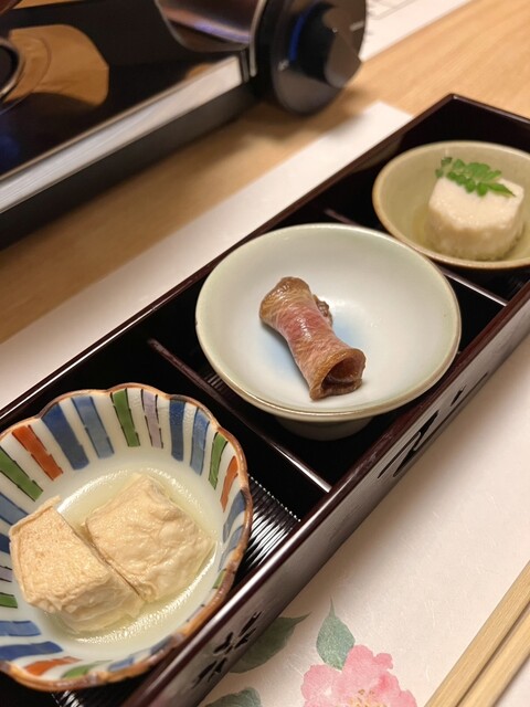 揚げ湯葉の煮物、牛たん味噌漬け、海老芋の煮物