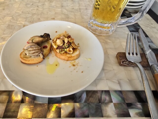 ・ブルスケッタ(ボッタルガとマスカルポーネ/自家燻製オイスター)