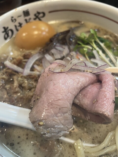 トッピングは柔らかいローストビーフ、これがまた最高、そして牛すじ煮は甘くて美味すぎ、スープに溶け込んで