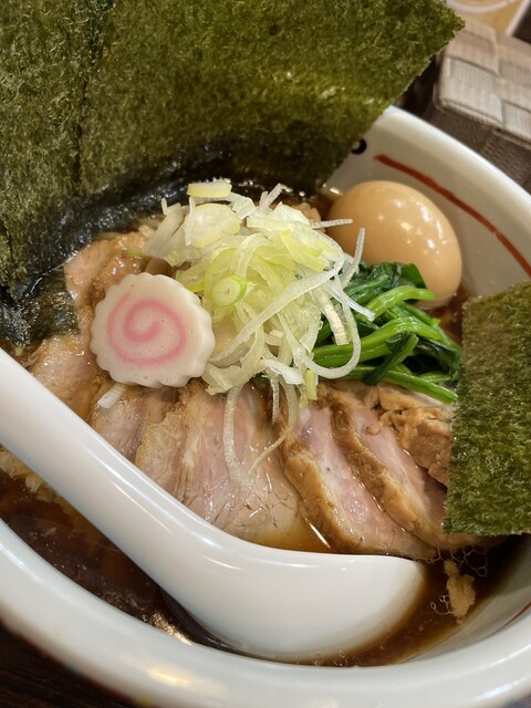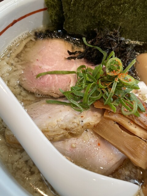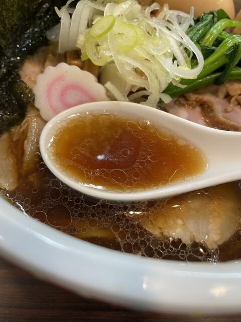 豚骨、鶏豚ガラに乾物、野菜に香川、千葉産片口鰯、羅臼昆布等を加えたベースに湯浅醤油のカエシを使い、大量の岩中豚の背脂を加えたスープ…