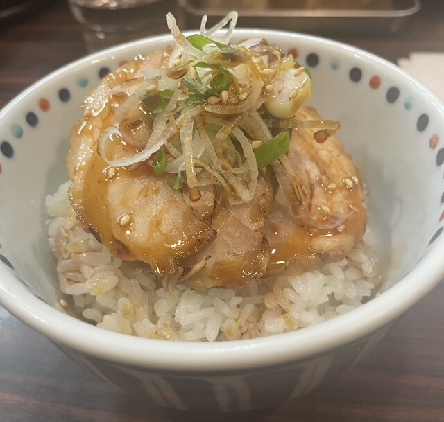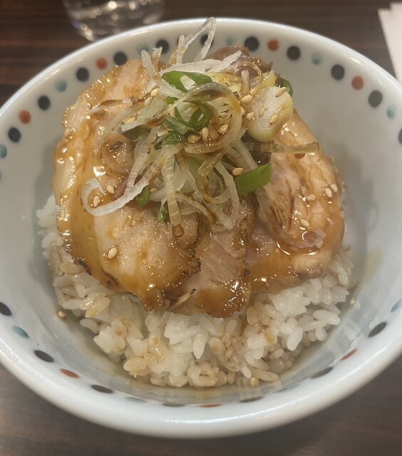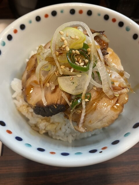 サイドメニューのチャーシュー丼はチャーシューが3枚、甘辛のタレが絶品❣️ 日の丸が刺さった味玉、スープに浸した海苔を加えて食べると最高‼️