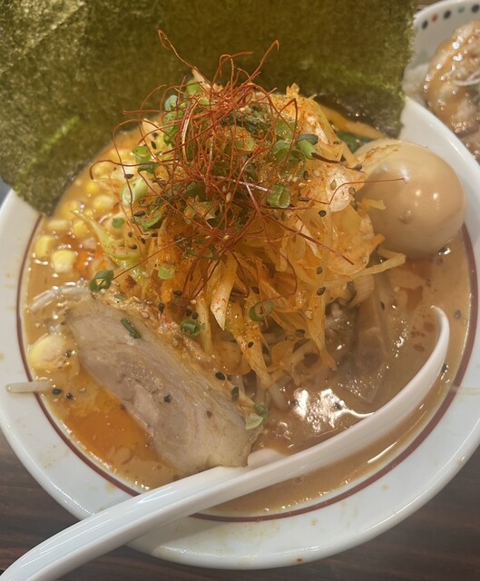 日曜日限定の特濃海老味噌麺に炒め野菜、海苔、コーンを