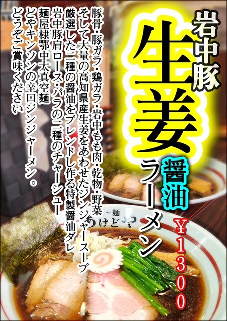 スープは鶏豚乾物野菜に厳選醤油、高知県産生姜を使ったジンジャースープ、生姜強めでキレあるカエシが効いて