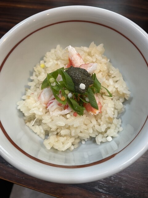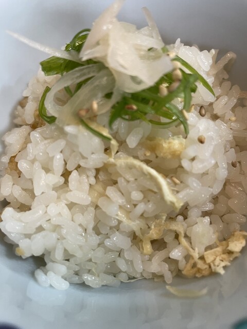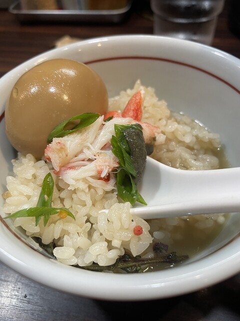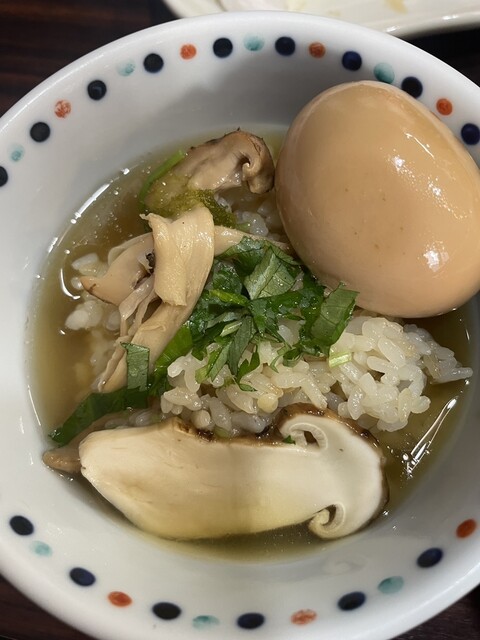 〆は生姜雑炊、残ったスープを新生姜炊き込みご飯に入れて、真薯に味玉を加えて、パーフェクト完飲完食