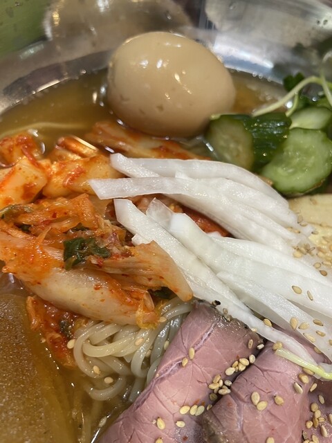 トピの胡瓜、甘酢大根、林檎、和出汁、牛叉焼も旨い 胡瓜、大根の味付けが抜群、林檎は甘い、冷麺にピッタリの具材です