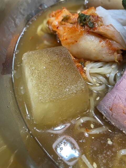 牛鶏骨清湯に水キムチ、韓国醤油を加えた冷製スープは酸味、辛味のバランス抜群でめちゃ旨っ❣️