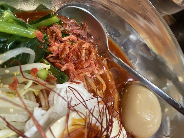 鶏、節ベース+辛味噌ダレ冷製スープに岩中豚旨辛ミンチに必殺納豆が辛痺をマイルドにして旨さ⤴️