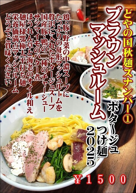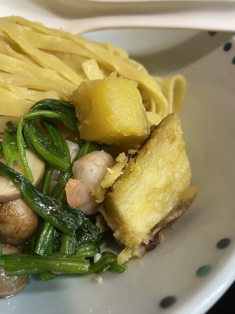 叉焼、さつまいものバター煮、法蓮草に小海老等の豪華トピにモチピロ之棣鄂極太平打ち麺がスープに絡みます。